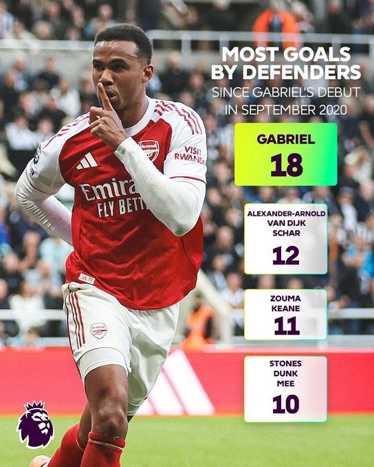 Dữ liệu ngày 29 tháng 9 cho thấy kể từ khi ra mắt Premier League vào tháng 9 năm 2020, hậu vệ của Arsenal Gabriel đã trở thành hậu vệ với nhiều bàn thắng nhất trong cùng giải đấu, xếp hạng đầu tiên với 18 bàn thắng.