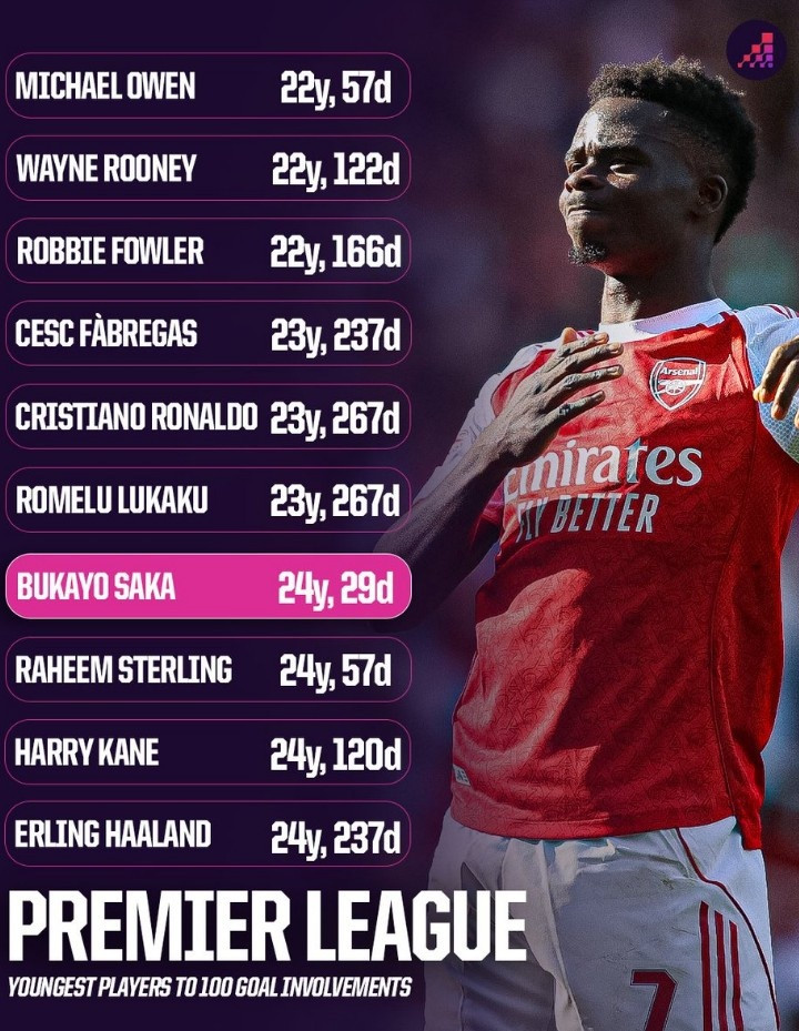 Dưới đây là kỷ lục trẻ nhất để tham gia trực tiếp vào 100 bàn thắng trong lịch sử Premier League, với Saka xếp thứ 7.