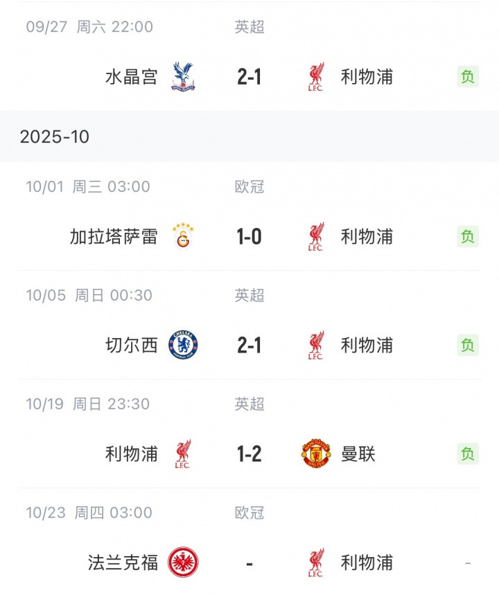 Ngày 20 tháng 10: Liverpool thua Manchester United 1-2 trên sân nhà và chịu 4 trận thua liên tiếp trên mọi đấu trường. Nếu thua Frankfurt ở trận sân khách Champions League vào giữa tuần, Liverpool sẽ có chuỗi 5 trận thua đầu tiên kể từ tháng 9 năm 1953.